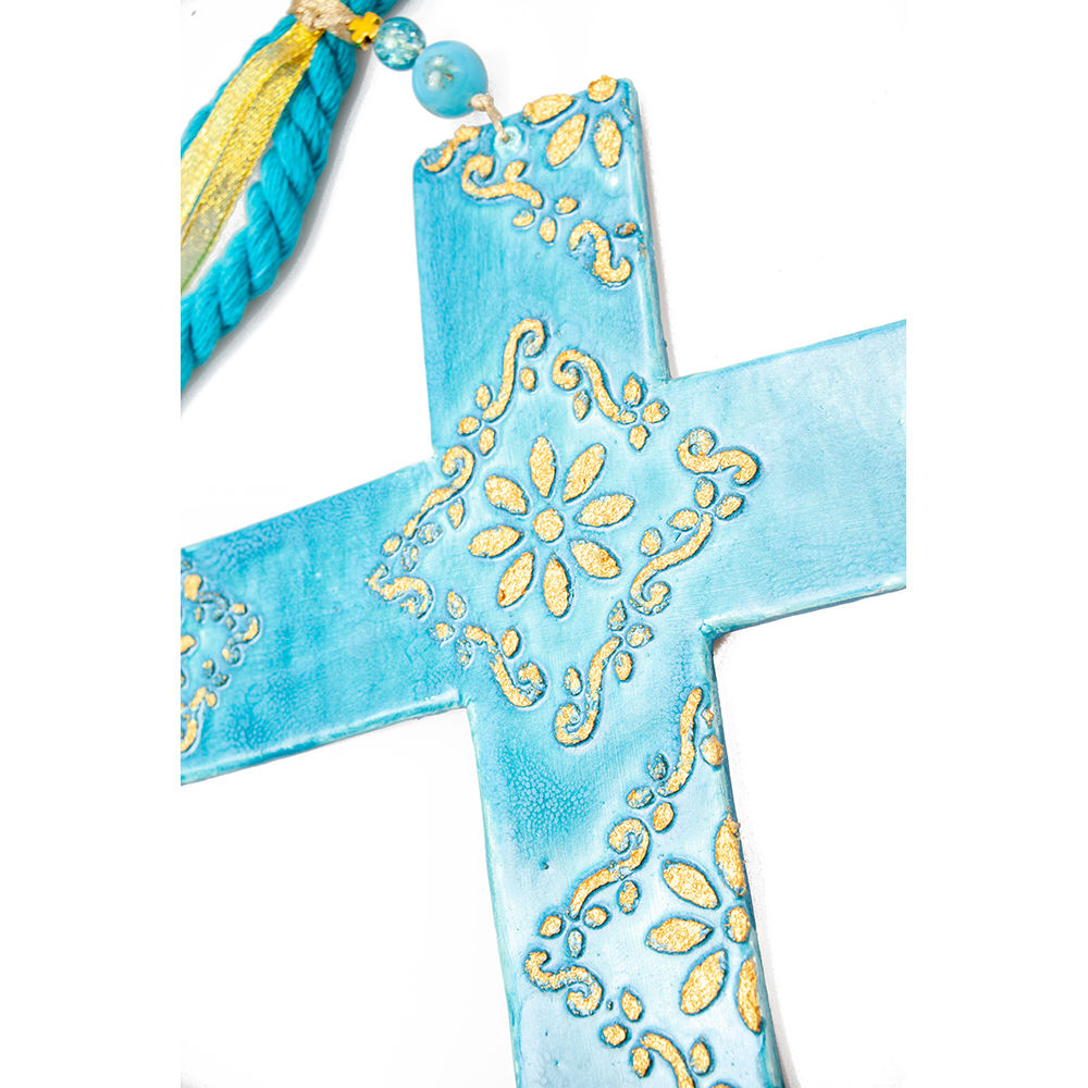 Air dry clay enameled bas-relief turquoise cross with golden modeling paste designs. Such a whimsical piece of art that could be decorated in any wall of your home. Its masterfully designs make up a unique orthodox cross that could be gifted for any occasion.