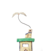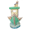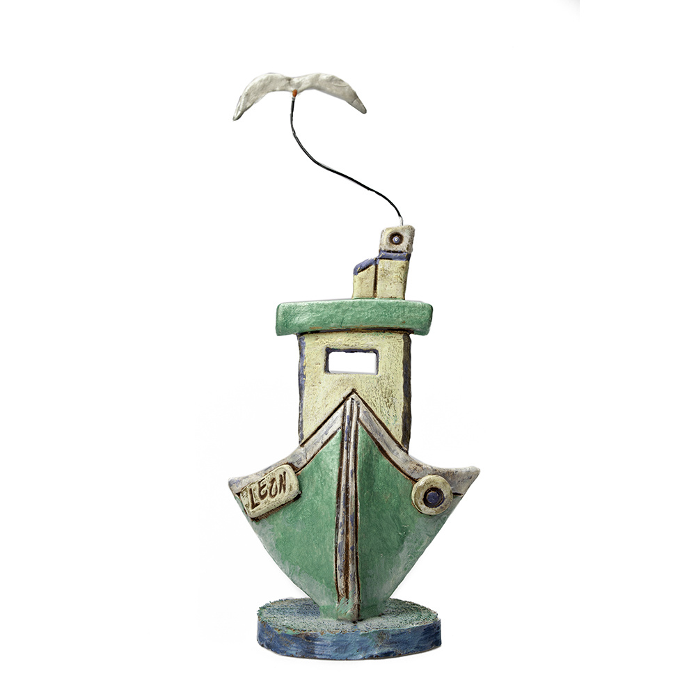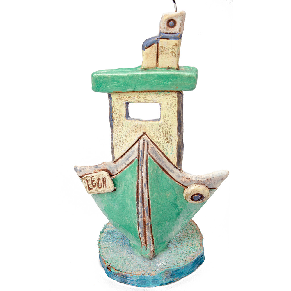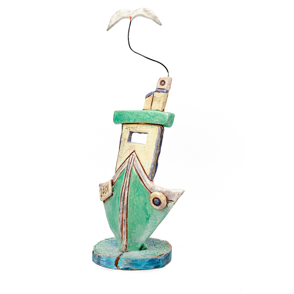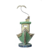 Ceramic folk Greek boat prow as a centrepiece. The vessel of the boat is made of air dry clay finished with light green enamel and yellow acrylic color, based on a slice of real wood. On the top, it is decorated with wire that ends in the shape of a clay seagull. It stands on its own, so it is easy to use it in a cabin, a coffee table, a self in the wall, or even to decorate the kitchen table. No matter where you live, add a Greek summery vibe to your home with these coastal decor table accessorie and make happier your friends or relatives as an original and unique gift for any occasion.