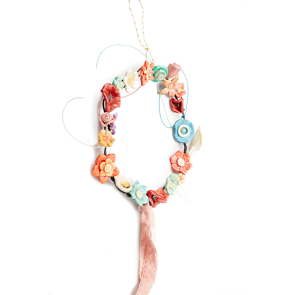 Handmade metal wreath with clay enameled flowers in different colours and shapes. It is decorated with multicolor ribbons and a pink lace as a bow at the bottom of the wreath.This wonderful spring wreath could be hanged outside of your front entrance in Spring! It is suitable to be decorated In your living-room above a fireplace maybe as well as in the kitcen too! A perfect gift for any occassion.