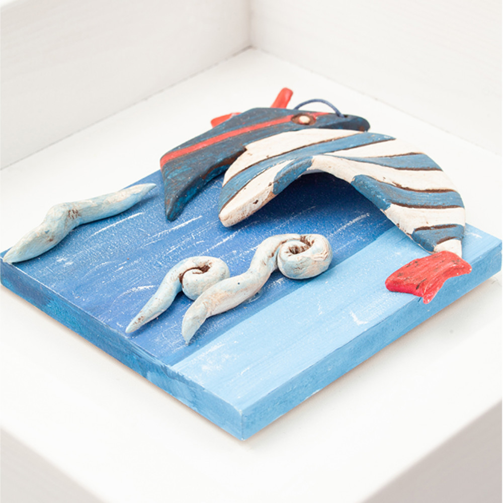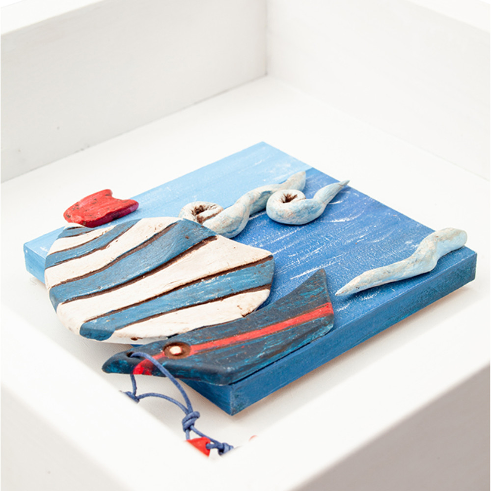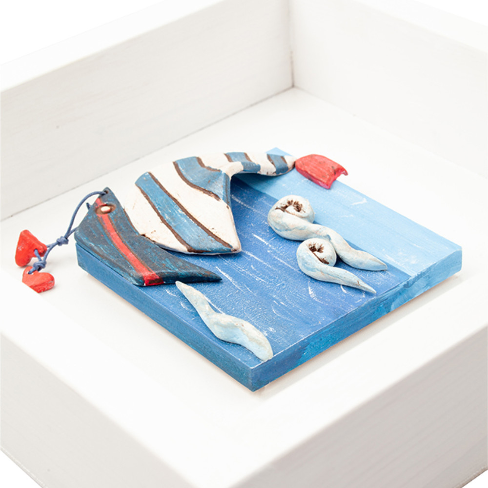 This delighful ceramic yacht sailing on calm seas is set against a turquoise-blue sky, reminding us the shades of Aegean Sea and the shiny sky of Greece! The sails of the boat are striped white-blue inspired by the colours of Greek flag. The vessel is blue with a red line and on the prow there is a hole where it is hanged a cord with a couple of decorative red hearts! Also there are two ceramic swirl winds very reminiscent of the strong winds prevail on Summer in Greece!.Finally, some of the waves are ceramic too, complementing the hole artwork!This ceramic sailboat will be loved by your little (or big!) sailors while it will bring a summery vibe and a nice mood to any room, recalling seaside holidays. Perfect solution as a gift for baby shower, first birthday, newborn and for many more occasions! You could match and embellish your decor with a variety of our designs and make a complete interior, adding two or three frames to a wall.