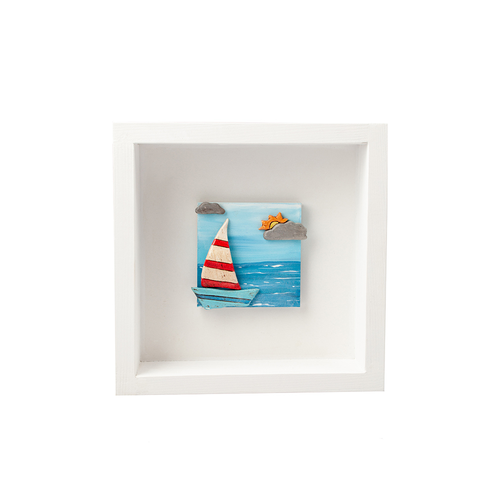 This cute wooden framed box with a ceramic sailing boat is suitable for a nautical home decor. It can be a wonderful nautical accent on a wall, in a self because of it’s freestanding position or complement of the decor in the little hotels and guesthouses seaside. Wherever be placed, in a nursery or in a big nautical themed kid’s room will be an intriguing addition, modern, fun and practical. The striped sales of the boat, the hidden sun behind clouds are really realistic and give a wanderlust sensation! You could match and embellish your decor with a variety of our designs and make a complete interior, adding two or three frames to a wall.