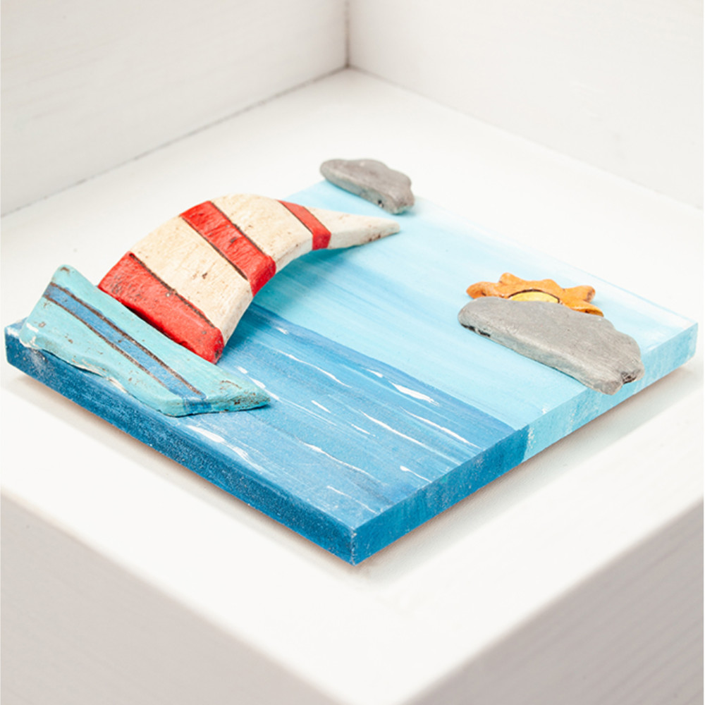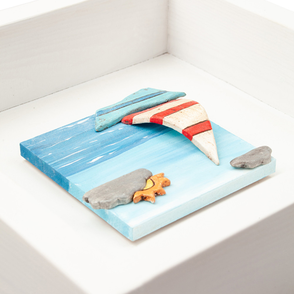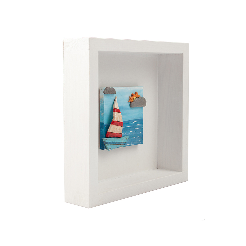 This cute wooden framed box with a ceramic sailing boat is suitable for a nautical home decor. It can be a wonderful nautical accent on a wall, in a self because of it’s freestanding position or complement of the decor in the little hotels and guesthouses seaside. Wherever be placed, in a nursery or in a big nautical themed kid’s room will be an intriguing addition, modern, fun and practical. The striped sales of the boat, the hidden sun behind clouds are really realistic and give a wanderlust sensation! You could match and embellish your decor with a variety of our designs and make a complete interior, adding two or three frames to a wall.